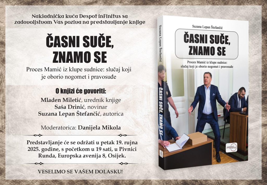 Ulomak je to knjige „Časni suče, znamo se“, autorice Suzane Lepan Štefančić, a koja je nedavno objavljena u izdanju nakladničke kuće Despot Infinitus. Iza Suzane su 23 godine novinarstva, od kojih je 18 godina provela u Večernjem listu, kao dopisnica iz Osijeka. Knjiga „Časni suče, znamo se“ i nastala je kao rezultat njezina praćenja procesa Mamićima za Večernji list.