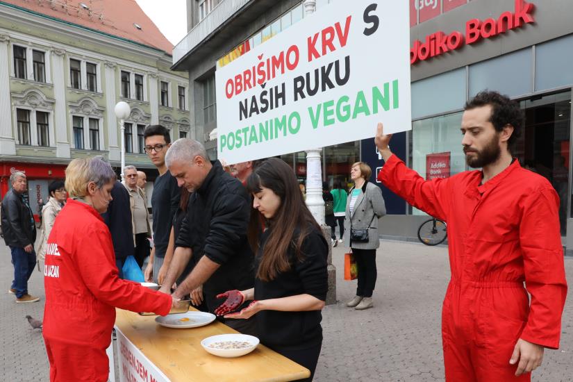 Zagreb, 02.11.2018 - Aktivisti Prijatelja životinja, povodom Svjetskog dana veganstva koji se diljem svijeta slavi 1. studenoga, održali su performans kojim žele uprizoriti odgovornost svakog pojedinca za vlastiti izbor hrane na tanjuru.