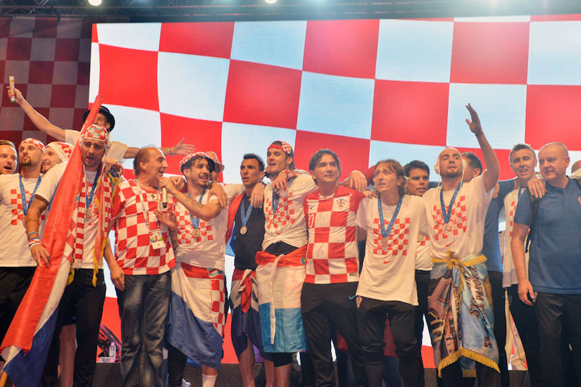 Zagreb, 16.07.2018 - Hrvatska nogometna reprezentacija, koja je osvajanjem drugoga mjesta ostvarila povijesni uspjeh na Svjetskom prvenstvu u Rusiji, stigla je u ponedjeljak neto prije 21 sat u otvorenom autobusu s prepoznatljivim crveno-bijelim kvadratiæima na Trg bana Josipa Jelaèiæa, gdje je za Vatrene organiziran spektakularan doèek koji je nadmaio sve dosadanje doèeke sportskih junaka u Hrvatskoj.