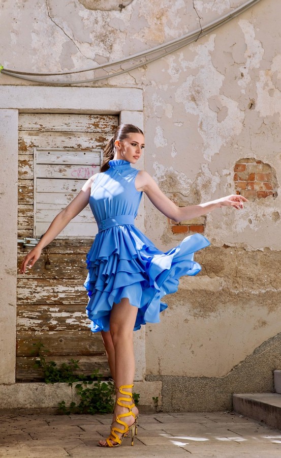 La Transition objedinjuje oba izraza: gornji dio u bež tonu prelazi u plavi donji segment, dok bogato oblikovan ovratnik dodatno naglašava prijelaz, stvarajući vizualno i konceptualno središte kolekcije. Haljina koja priča o promjeni bez prekida, o kontinuitetu koji je sam po sebi najljepši oblik slobode.
