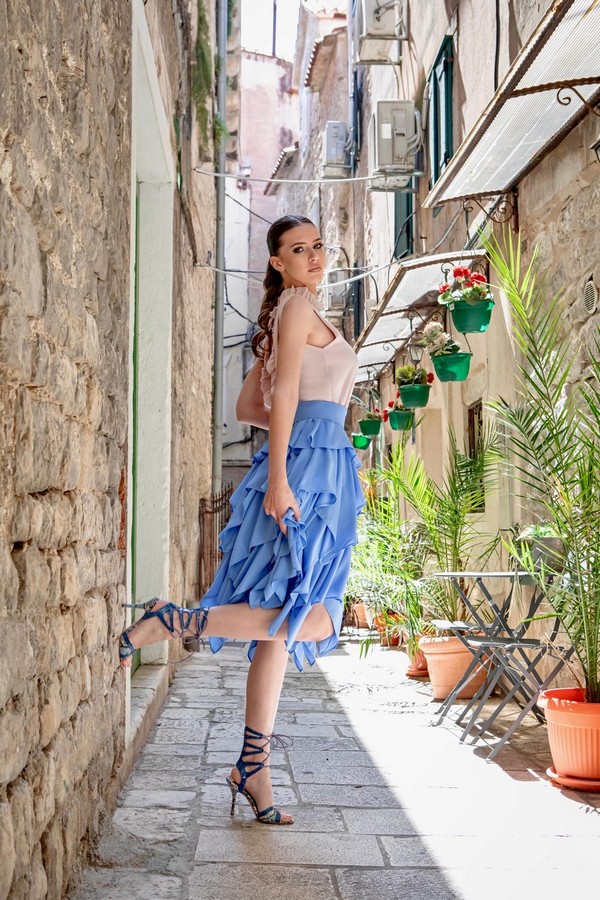 Kolekcija se oblikuje oko ideje ravnoteže između kontrole i oslobađanja. Konstrukcija odjevnih komada naglašava precizno definiranu siluetu: strukturirani gornji dijelovi i istaknuti struk uspostavljaju jasnoću forme, dok slojeviti, kaskadni volani unose pokret, lakoću i osjećaj fluidnosti. Upravo u toj napetosti između arhitektonske discipline i mekoće materijala razvija se prepoznatljiv vizualni identitet kolekcije.