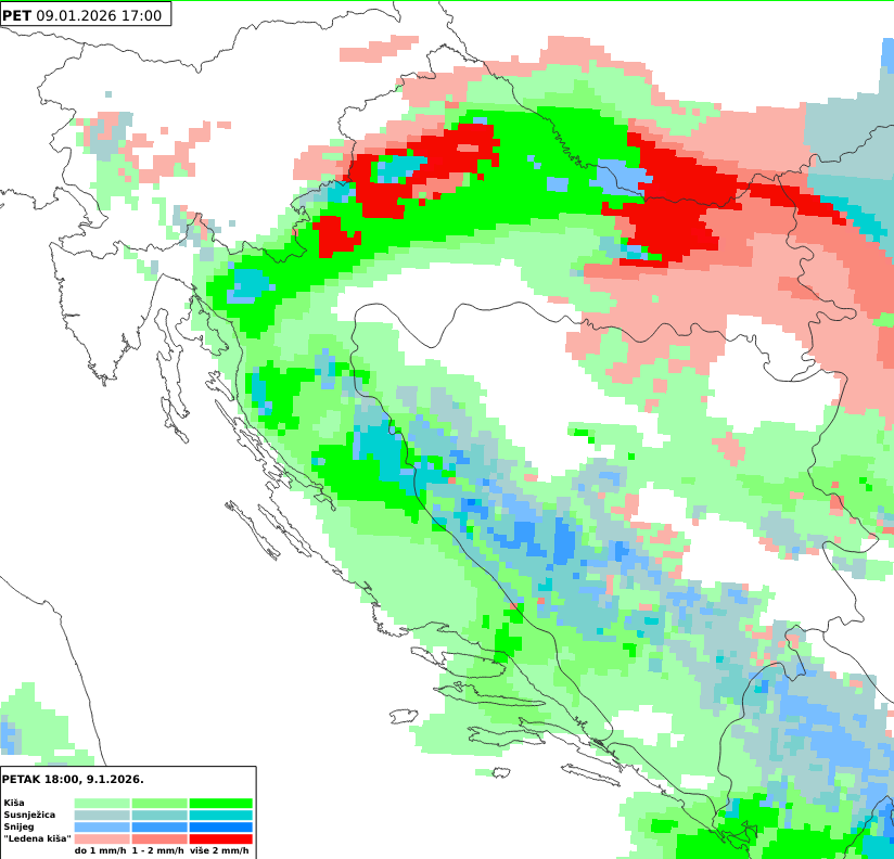 . Prognoza vrste oborine prognostičkog modela Aladin za petak, 9. siječnja 2026. u 17 UTC (18 sati po lokalnom vremenu). Crvena boja označava kišu koja se smrzava, plava boja susnježicu i snijeg, a zelena kišu. Različite nijanse boja predstavljaju različite intenzitete oborine.