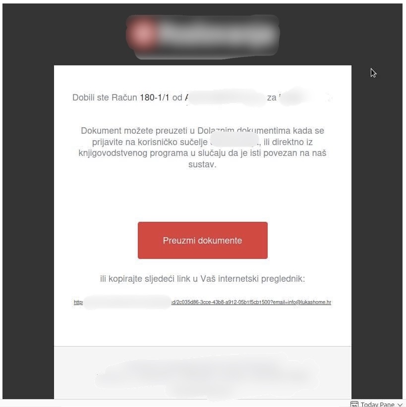 Riječ je o porukama koje izgledaju kao legitimne obavijesti o zaprimljenom dokumentu, najčešće računu ili otpremnici te sadrže gumb poput „Preuzmi dokumente“