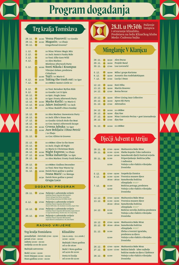 Vrijeme je za pravu zimsku čaroliju! Počinje Advent u Samoboru uz bogat i raznovrstan program za sve generacije. Program započinje u petak, 28. studenoga u 19:30 sati paljenjem lampica i otvaranjem klizališta, uz čarobnu predstavu na ledu „Čudesna bajka” Klizačkog kluba Medo koja će obilježiti početak ovogodišnjih blagdanskih događanja u Samoboru. Večer se nastavlja hitovima „Da znaš“ i „Neka ljudi govore“, velikim koncertom legendarne Vesne Pisarović od 21 sat na Trgu kralja Tomislava.