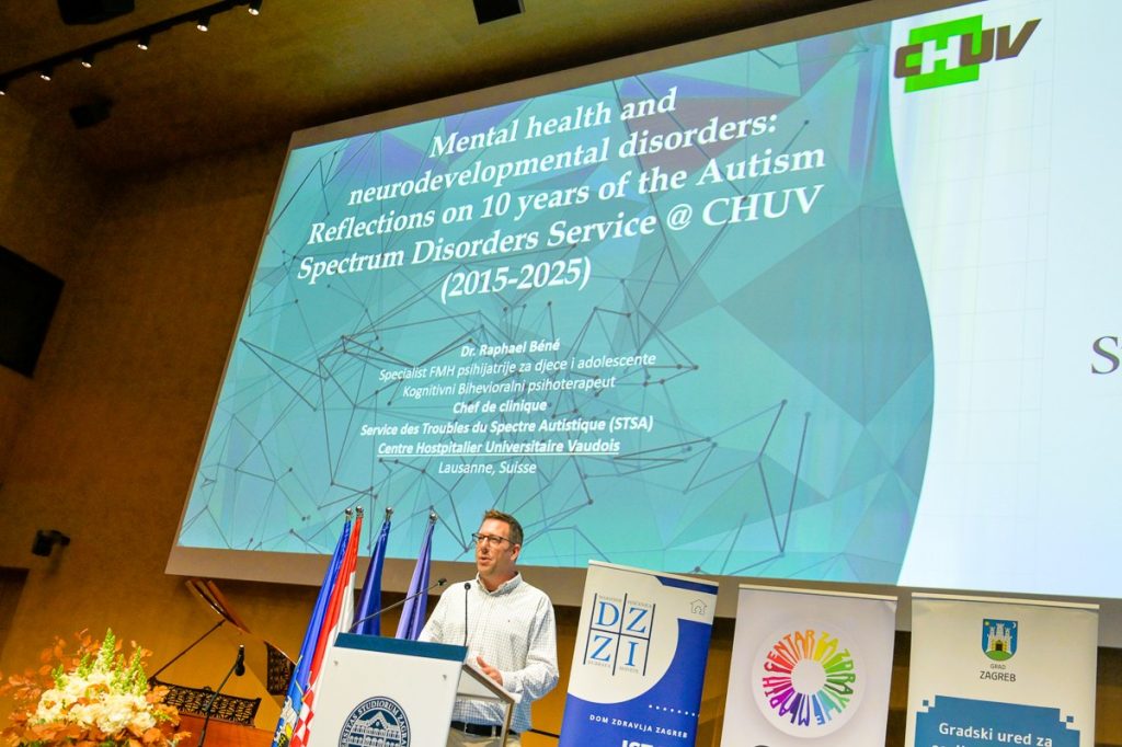 Plenarno izlaganje održao dr. Raphaël Béné, specijalist dječje i adolescentne psihijatrije i kognitivno-bihevioralni psihoterapeut s Klinike za neurorazvojne poremećaje Sveučilišne bolnice CHUV u Lausannei, Švicarska, koji je sudionike proveo kroz desetljeće iskustva rada s osobama iz spektra autizma, povezujući kliničku praksu s temom Simpozija – Um na rubu budućnosti. Poseban naglasak stavio je na doprinos autističnih i neurodivergentnih osoba, čije jedinstvene kognitivne perspektive oblikuju razvoj digitalnih tehnologija i umjetne inteligencije. Kroz otpornost, kreativnost i društveni utjecaj, neurodiverzitet zaista oblikuje budućnost – stoga su sudionici imali privilegiju čuti tu priču iz prve ruke.
