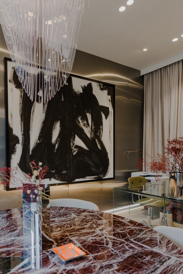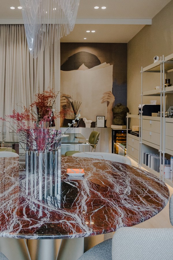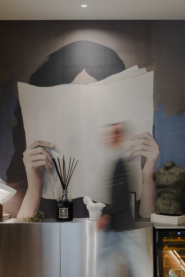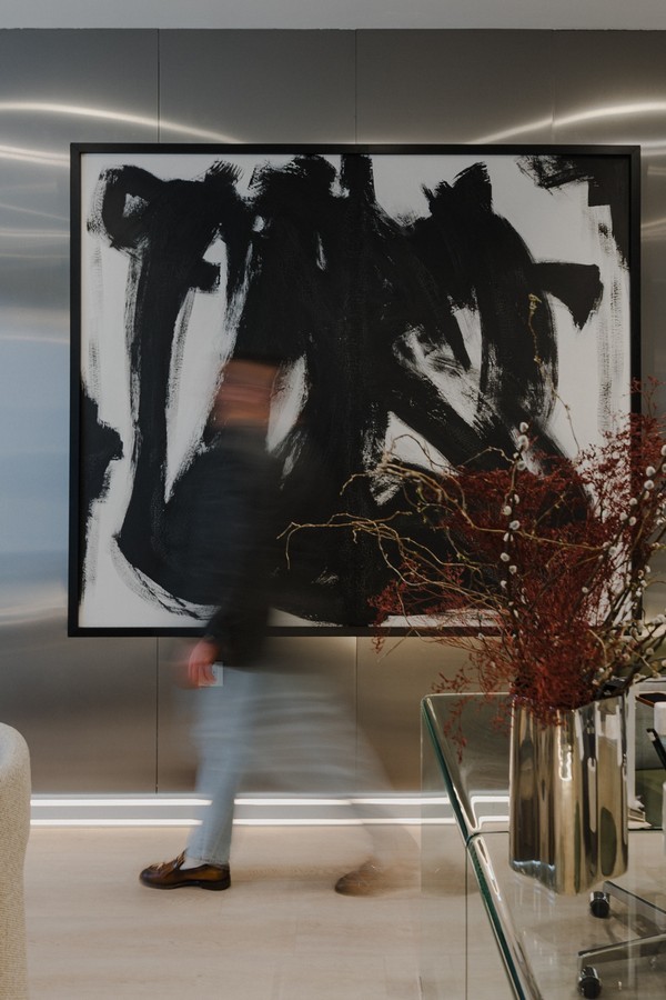 Zidovi studija kriju priču o lojalnosti i sinergiji; tu su specifične zidne tehnike, zid u brušenom inoxu i tapete nastale u suradnji s renomiranim hrvatskim tvrtkama s kojima Ivan surađuje od prvog dana. Cijelu priču zaokružuje impresivno autorsko djelo Jane, dizajnerice i Ivanove bliske poslovne partnerice čija djela često krase njegove projekte. Ured služi i kao vrhunski showroom gdje klijenti, dok ispijaju kavu na sastancima, mogu osjetiti teksture i materijale koji će sutra postati dio njihovog svakodnevnog luksuza.
